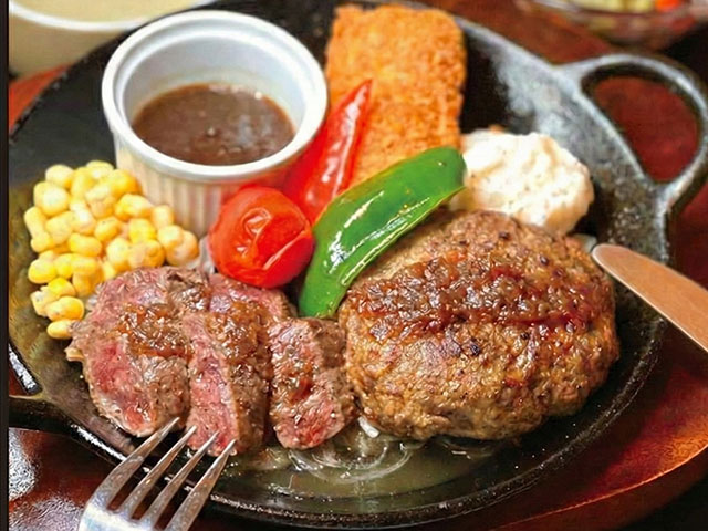 ふっくらジューシーなハンバーグと、香ばしく焼き上げたステーキを一皿で楽しめる肉好きのための贅沢コンボ。